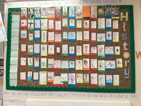 In History Year 1 have been learning about chronology. They all brought in a baby photo of themselves and drew a picture of each milestone they have reached up until the age of six. We then plotted the pictures on a timeline.