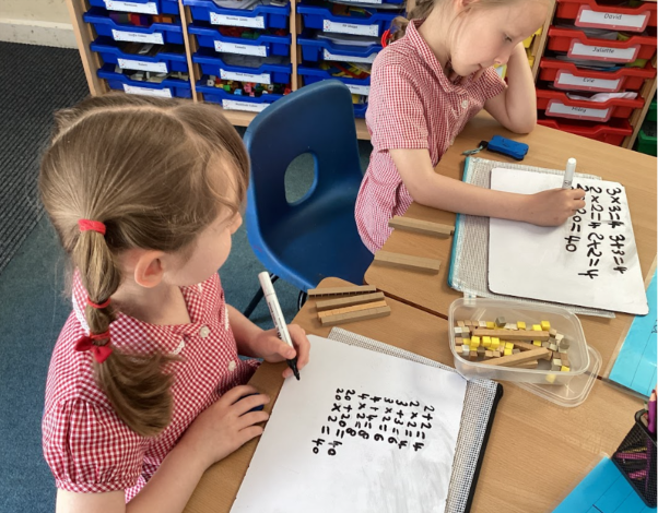 In maths, we have been learning how to multiply and divide as well as telling the time to o’clock and half past.