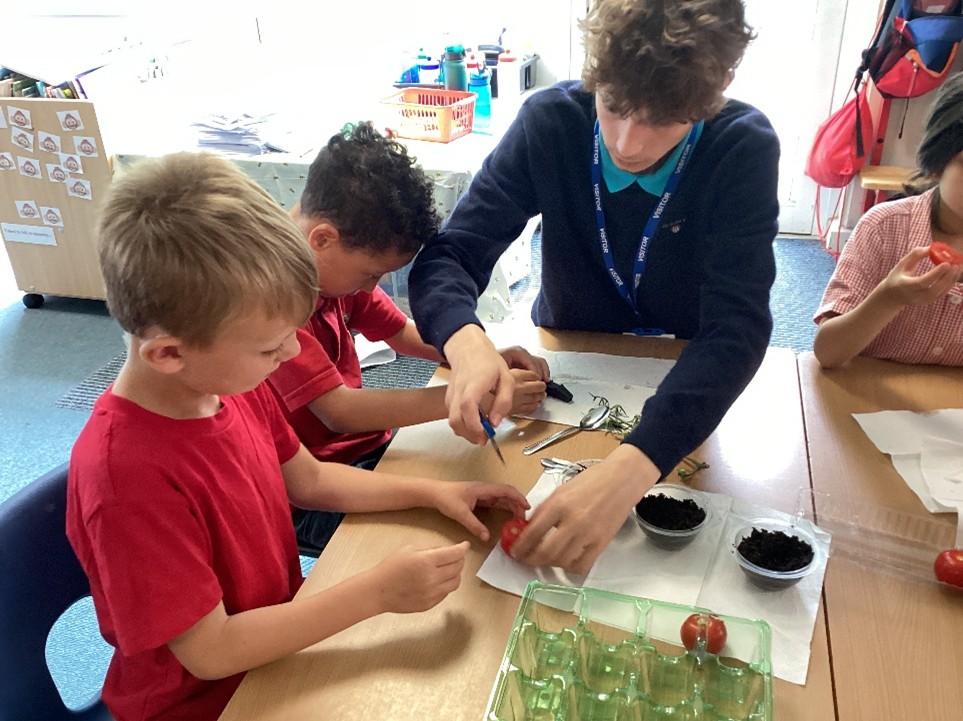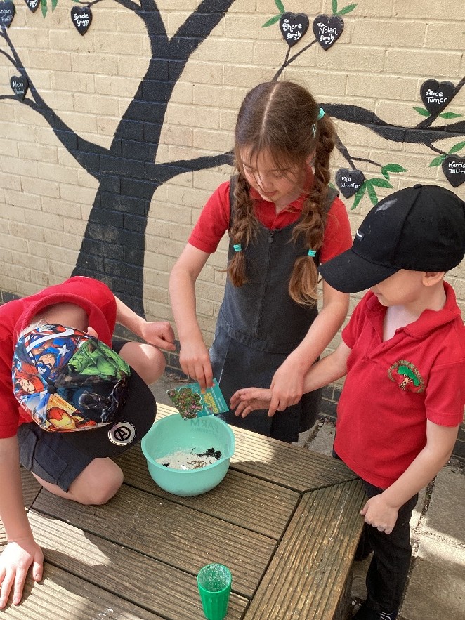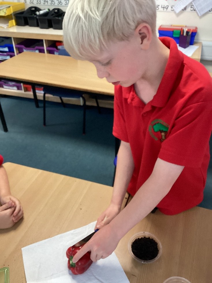 In our plants topic in science, Year 2 have learnt about the main parts of a plant and its flower, different kinds of plants and seeds and how they grow and survive. They made flower bombs, planted them and waited patiently for them to grow. They also cut fruits to find the seeds and then planted them.